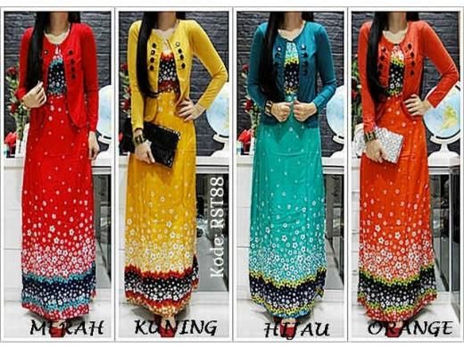 Gamis Cardi Resti RST88, gamis setelan cardigan dengan motif bunga-bunga pada maxidress dan polosan pada cardigan, maxi tanpa lengan sedangkan cardigan lengan panjang diberi hiasan kancing mati pada pinggiran tengah cardi.